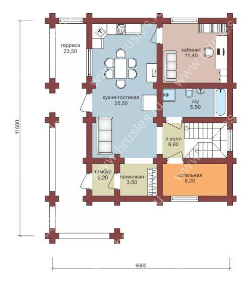 Дом из оцилиндрованного бревна Виктория – проект с полноценными двумя этажами и особенной архитектурой. Внешне простая коробка дополнена террасой с Г-образным углом под навесом и двускатной люкарной над ним. В планировке задает стиль прямоугольная вытянутая форма кухни-гостиной с выходом на террасу. Наличие котельной делает проект пригодным для круглогодичного использования. Второй этаж занимают 2 спальни и просторный ТВ-зал.
